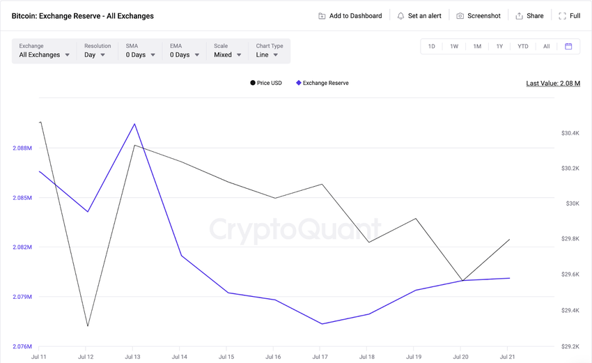 Pada tanggal 13 Juli, saldo Exchange Reserve adalah 2,09 juta BTC. Namun, hingga tanggal 21 Juli, saldo tersebut sudah berkurang sebanyak 10.000 BTC.