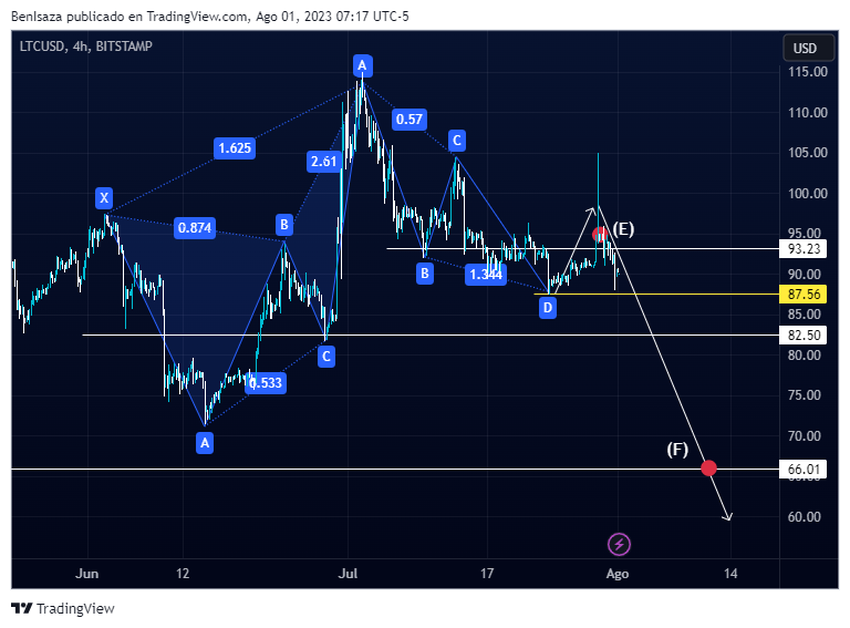 Benjamin Isaza, analis dan trader di BeInCrypto, menggambarkan adanya pola “butterfly” pada grafik Litecoin. Pola seperti itu menunjukkan adanya perubahan tren dalam pergerakan harga LTC. Maka dari itu, target terdekat berikutnya berada di level US$66, dengan probabilitas sebesar 86% antara bulan Agustus dan September.