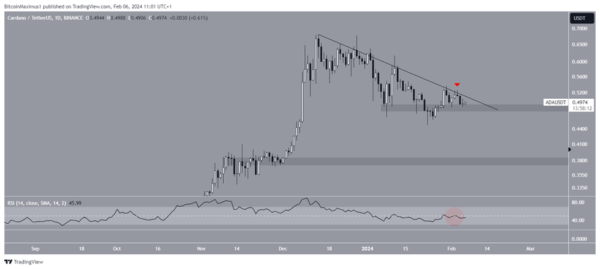 Analisis teknikal pada time frame harian memperlihatkan bahwa ADA telah terjatuh di bawah garis tren resistance menurun sejak bulan Desember 2023. Kemudian pada 23 Januari 2024 lalu, penurunan tersebut menemui ujung di titik terendah US$0,45.