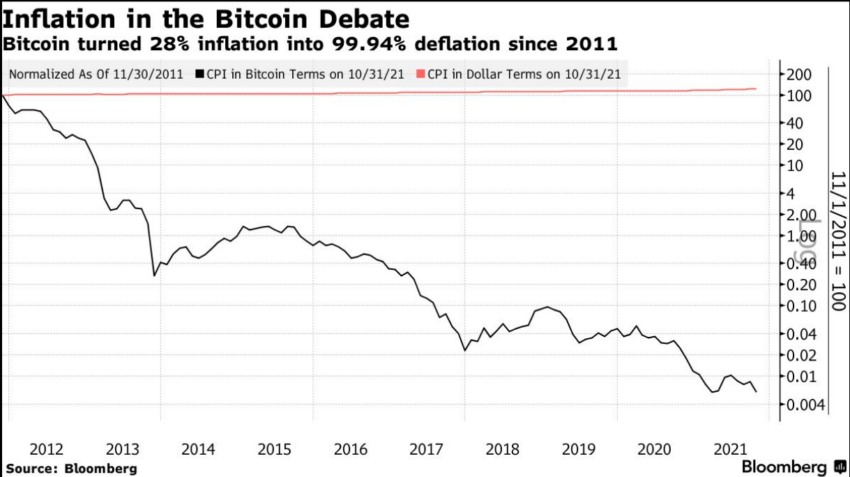 Antara tahun 2011 dan 2021, data dari Bloomberg menunjukkan bahwa meski CPI utama (termasuk biaya makanan dan energi) naik 28%, nilai Bitcoin menurun selaras dengan CPI. Sehingga, apa pun yang berharga 1 Bitcoin pada tahun 2011, berharga 0,004 satoshi pada tahun 2021. Satu satoshi adalah seperseratus juta dari 1 Bitcoin. Dengan kata lain, nilai Bitcoin meningkat ketika dolar terdevaluasi.