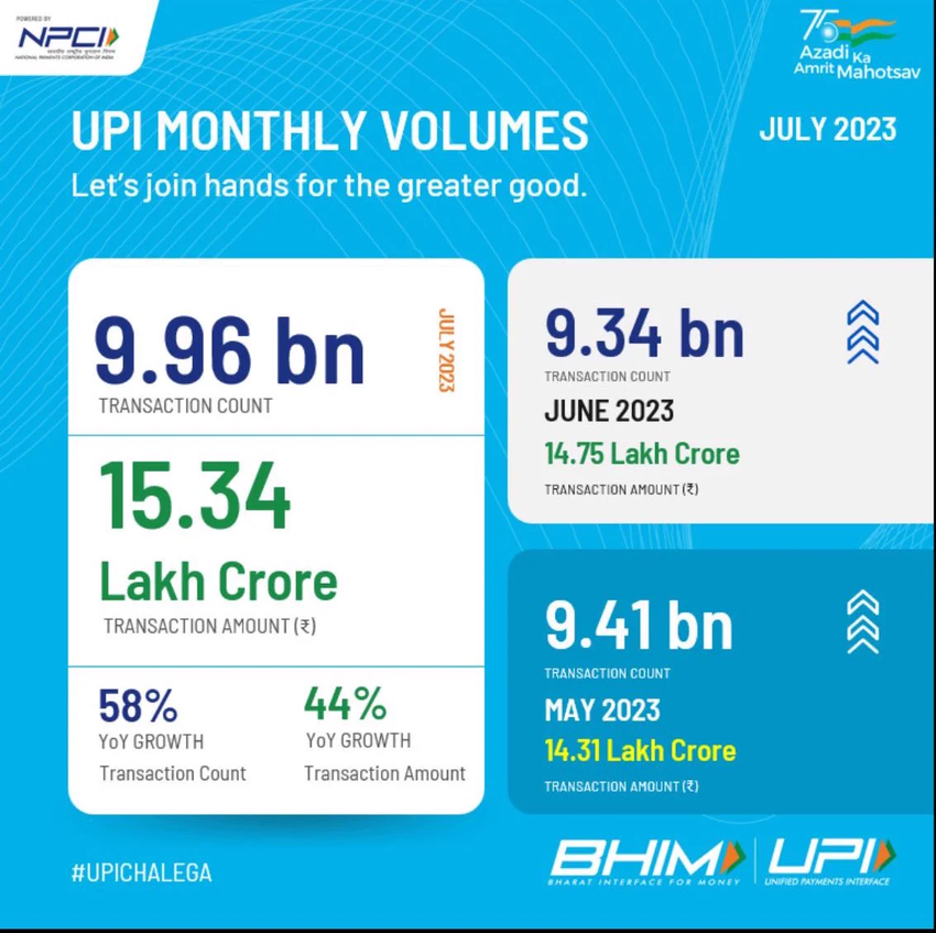 Bulan lalu saja, UPI berhasil membukukan 9,96 miliar transaksi. Dan para pengguna melakukan transaksi sebesar 15,34 triliun INR (US$185,64 miliar) menggunakan fasilitas UPI hanya dalam satu bulan. Khususnya, pada Juli, UPI mencetak pertumbuhan year-on-year sebesar 58% dalam hitungan transaksi (Transaction Count) dan 44% pertumbuhan year-on-year dalam jumlah transaksi (Transaction Amount).