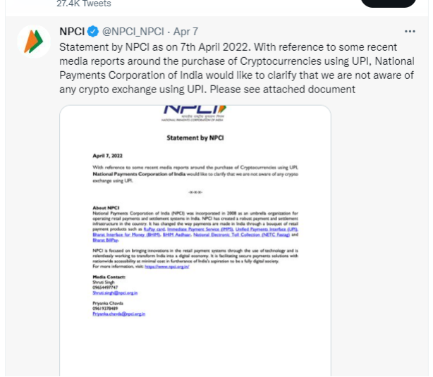Namun, NPCI pada hari Kamis lalu mengatakan, beberapa jam setelah peluncuran perdagangan Coinbase di India, NPCI mentweet “tidak mengetahui adanya crypto exchanger yang menggunakan UPI”