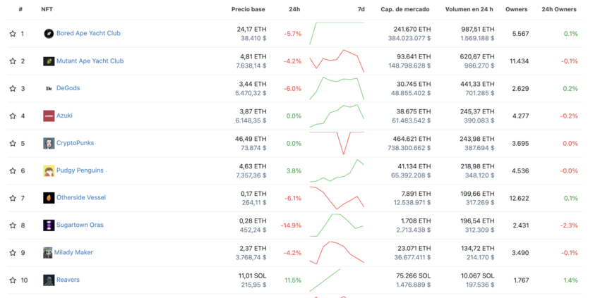 Sementara itu, 10 proyek NFT paling menguntungkan adalah: Bored Ape Yacht Club, Mutan Ape Yacht Club, DeGods, Azuki, CryptoPunks, Pudgy Penguins, Otherside Vessel, Sugartown Oras, Milady Maker, dan Reavers. Namun, semua proyek ini mengalami kerugian antara 5,7 hingga 15%. Meskipun demikian, Reavers masih menunjukkan pertumbuhan sebesar 11,5% dalam 24 jam terakhir.