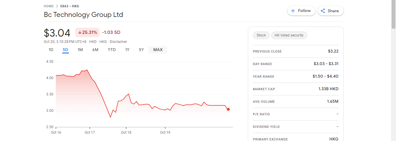 Kegeraman perusahaan terhadap rumor tersebut beralasan. Pasalnya, sejak kabar itu menguap ke publik, saham BC Technology terus anjlok. Dalam 5 hari ke belakang, pergerakan saham BC Technology Group sudah ambruk 25,31%, dari HK$4,07 di 16 Oktober menjadi HK$3,04 pada perdagangan hari ini (20/10).