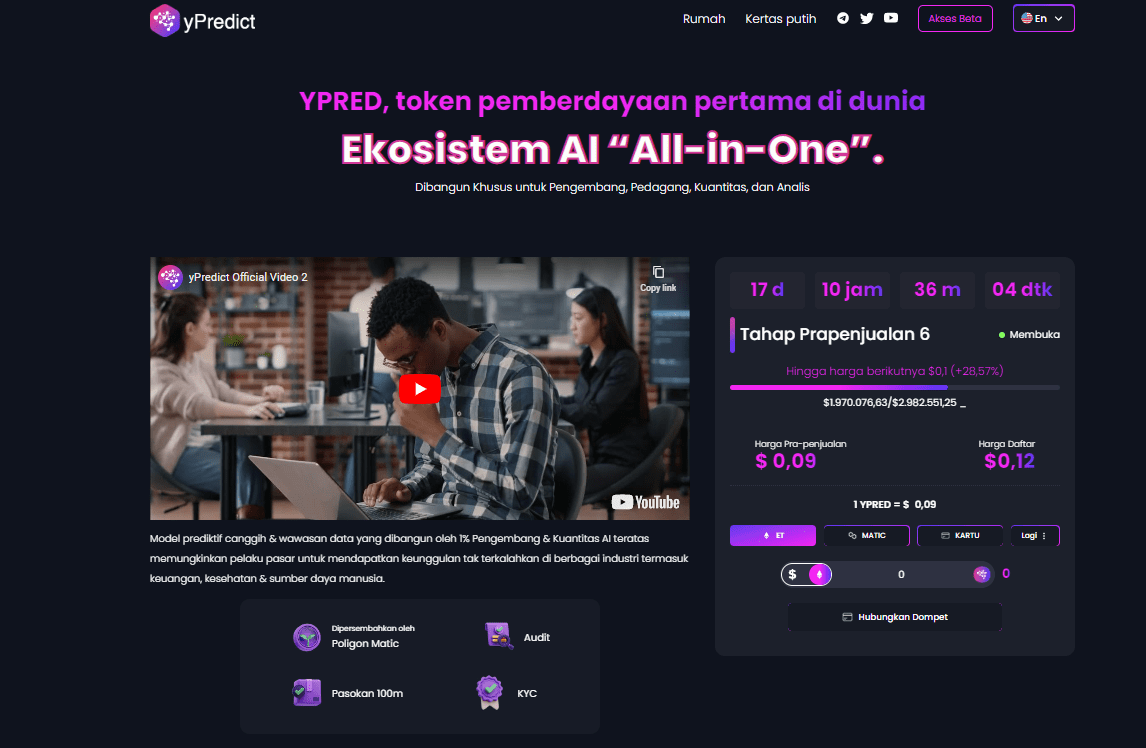 Manfaat memiliki token $YPRED sangat jelas. Dengan memiliki token ini, Anda dapat merasakan keuntungan dari kesuksesan yang diharapkan proyek ini. Bagi mereka yang tertarik dalam investasi kripto AI yang sedang populer ini, segera dapatkan token $YPRED dan jadilah investor awal, meskipun saat ini presale sudah berlangsung di tahap 6. Kunjungi website resminya dan jangan lupa untuk bergabung dengan group Telegram agar tidak ketinggalan berita-berita terbaru dari proyek kripto yang satu ini.