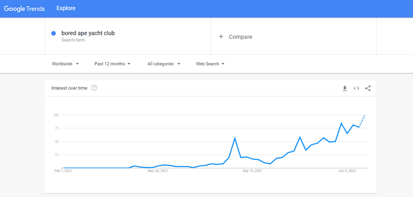Google Trends adalah alat gratis dengan kegunaan fantastis yang memberikan wawasan luas tentang opini publik mengenai suatu topik atau kata kunci. Penelusuran untuk kata tersebut dinilai dalam rentang 0 hingga 100. Peringkat yang tinggi menunjukkan bahwa orang tertarik pada sebuah koleksi NFT tertentu. Hal tersebut juga secara tidak langsung menandakan bahwa inilah saat yang tepat untuk membeli NFT.