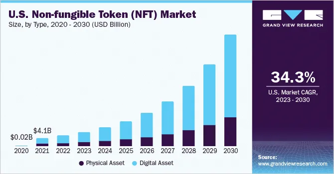 Grafik tersebut memperkirakan lonjakan signifikan di pasar NFT AS, yang berpotensi akan mencapai nilai tertingginya pada tahun 2030. Grafik tersebut juga mencatat Tingkat Pertumbuhan Tahunan Majemuk (CAGR) yang kuat sebesar 34,3% untuk pasar antara tahun 2023 dan 2030, yang menunjukkan bahwa pasar kemungkinan besar akan mengalami pertumbuhan yang konsisten dan dinamis selama periode ini. Karena itu penggunaan NFT wallet juga menjadi penting untuk menyimpan berbagai aset yang kini semakin kompleks.