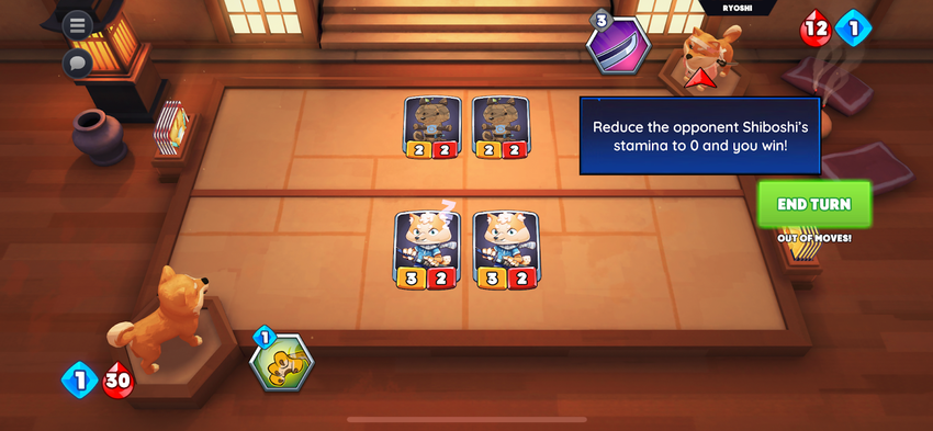 - Selama giliran kamu, kamu dapat menempatkan kartu di Dojo, memainkan kartu, dan menyerang lawan dengan Shiboshi milikmu.