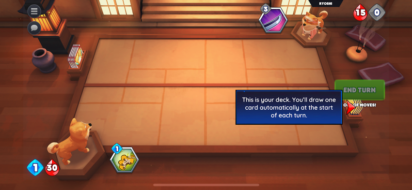 Dalam pertandingan pertama, Ryoshi akan memandu kamu. Game pengantar pertama akan mengajarkan semua yang perlu kamu ketahui tentang mekanisme game, seperti card deck, dojo (area tempat kartu berada, senjata, berbagai jenis kartu, dan sebagainya). Di sepanjang game pertama ini, kamu akan mulai terbiasa dengan mekanisme yang berlaku dalam game ini.