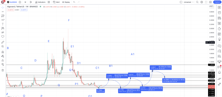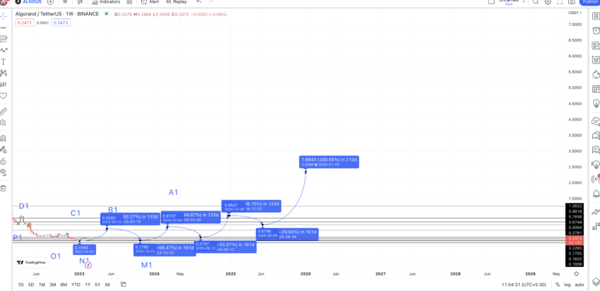 Sekarang kita bisa melihat pembentukan higher-high dan higher-low yang kuat pada grafik harga ALGO. Ini artinya, bahwa B atau B2 baru dapat mengikuti nilai rata-rata low-to-high 249,21% dan naik melampaui tingkat pada tahun 2025. Proyeksi ini menempatkan harga tertinggi tahun 2025 untuk ALGO di level US$0,9827.