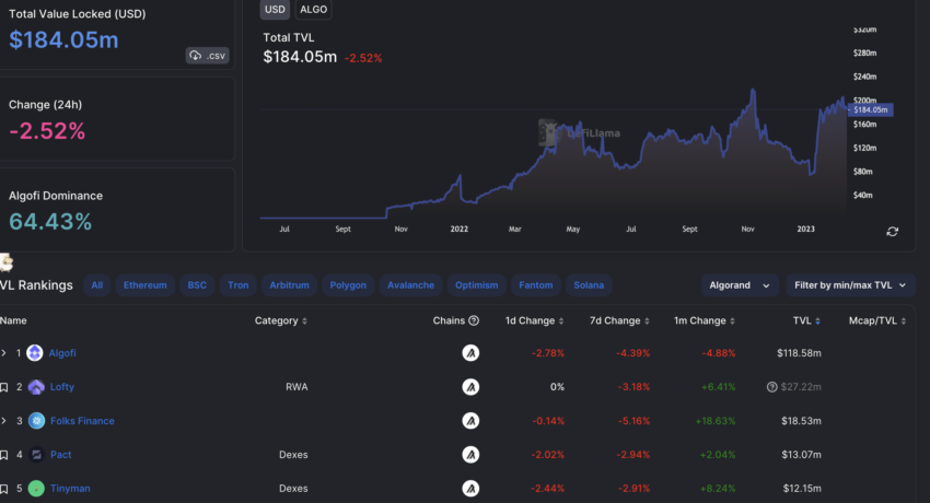 Bagi sebagian orang, Algorand tampil sebagai fasilitator DeFi utama. Saat ini, Algorand memiliki TVL yang bernilai US$184,05 dalam denominasi dolar, dengan AlgoFi menjadi protokol yang paling dominan. Sedangkan dalam peringkat DeFi global, Algorand saat ini berada di peringkat 16 berdasarkan TVL khusus chain.