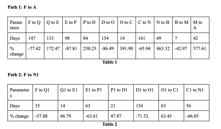 Sekarang kita punya beberapa tugas yang perlu ditunaikan. Pertama, kita perlu mencari perubahan persentase harga dan jarak antara titik-titik yang sesuai dengan dua rute: F ke A dan F ke N1. Hal ini akan membantu kita menemukan nilai rata-rata dari setiap pergerakan low-to-high dan high-to-low lainnya.