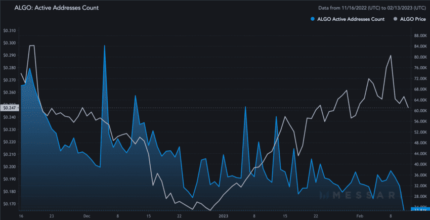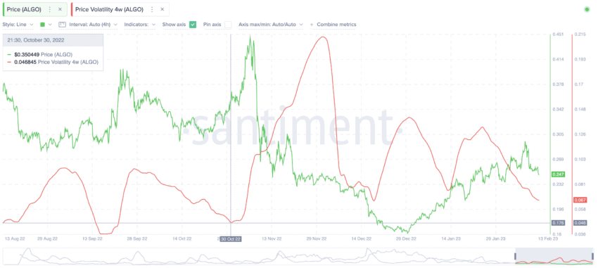 Metrik volatilitas harga selaam 4 minggu mengungkapkan tren yang menarik. Bisa kita lihat bahwa puncak volatilitas pada bulan Desember mendorong harganya turun cukup signifikan. Di sisi lain, titik terendah yang terbentuk pada awal November memang berhasil menyeret harganya naik. Maka dari itu, kita dapat berasumsi bahwa jika volatilitasnya mencapai titik terendah, harga ALGO berpeluang akan naik.