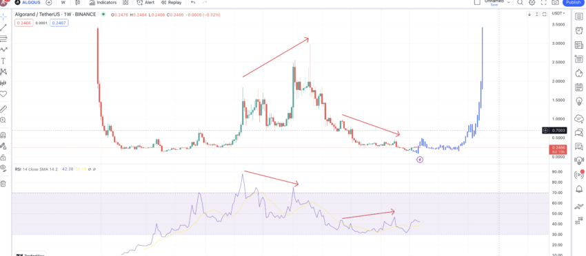 Bisa kita perhatikan bahwa mungkin ada bullish divergence yang terbentuk, yang dapat mendorong harga ALGO melebihi level tertinggi sebelumnya. Begitu hal itu terjadi, kita bisa memprediksi bahwa ALGO akan mengulangi pola yang serupa dengan sisi kiri grafik. Hal ini bahkan akan membantunya menyelesaikan pola foldback standar.