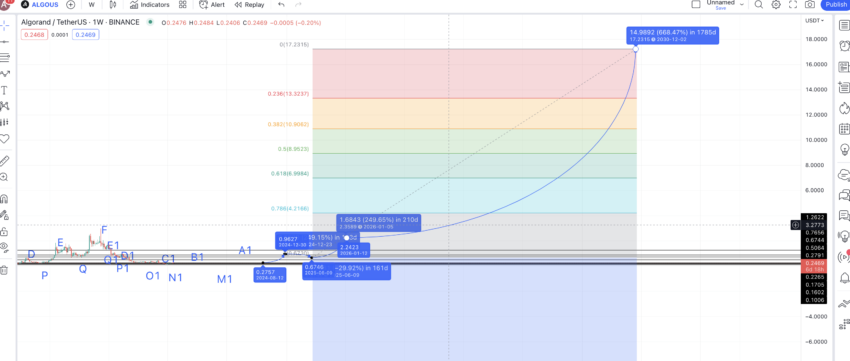 Nah, sekarang kita sudah punya titik tertinggi tahun 2026 dan titik terendah tahun 2025. Dengan menggunakan level Fib, kita dapat mengekstrapolasikan rutenya hingga tahun 2030. Proyeksi ini menempatkan prediksi harga ALGO untuk tahun 2030 pada level tertinggi US$17,23. Kita menggunakan prediksi ini dengan asumsi bahwa titik tertinggi sebelumnya di US$3,28 akan terlewati pada akhir tahun 2027 atau awal 2028.