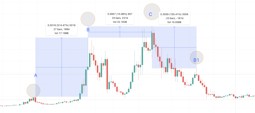 SponsoredDengan demikian, titik tertinggi berikutnya akan berada di US$0,0971, 420 hari dari titik C. Sekarang, kita dapat mengekstrapolasi dan melihat di mana posisi A1 akan berada.