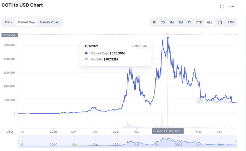 Titik tertinggi dari kapitalisasi pasar COTI tercapai pada 1 November 2021: