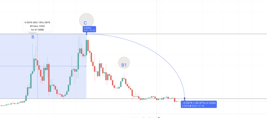 Nah, titik C sendiri saat ini berada di US$0,6821 atau titik ATH. Jika titik A1 adalah X, maka X = (0,6821 x 100)/ 702,19 = 0,0971.