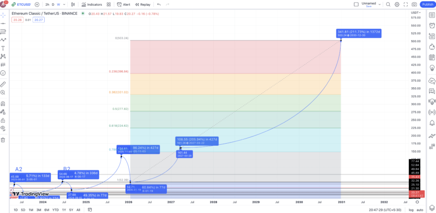 Karena kita sudah punya titik terendah tahun 2026 yang berada di level US$52,71, kita bisa mengharapkan bahwa titik tertinggi berikutnya akan mengikuti persentase terendah sebesar 205,71% lagi. Hal ini mengingat fakta bahwa mungkin sangat sulit bagi ETC untuk tumbuh mendekati 400% selama beberapa tahun berturut-turut, berdasarkan data historisnya.