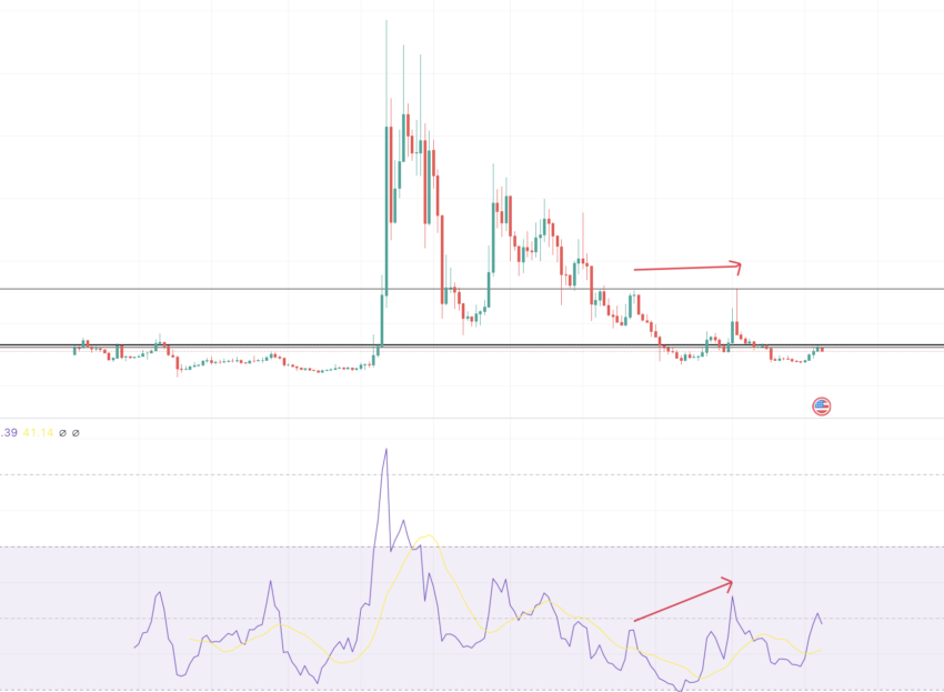 Dua garis merah yang berbentuk seperti panah pada grafik mingguan menunjukkan adanya pola bullish divergence. Momentumnya tampaknya meningkat, sementara harganya tetap relatif datar. Oleh karena itu, ke depannya mungkin akan segera terjadi reli harga kecil-kecilan.