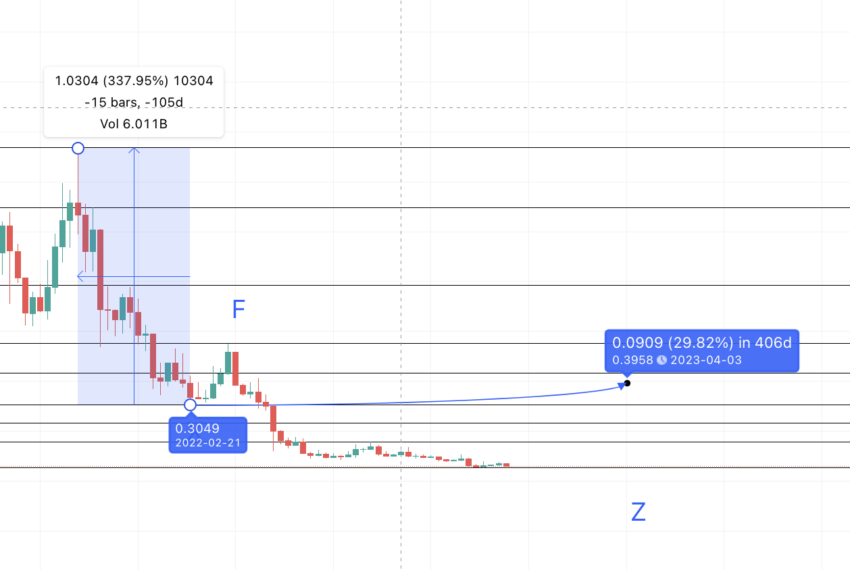 Tapi, untuk level US$0,3958, meskipun merupakan harga terendah dari pola ketiga, mungkin bukan harga minimum GRT pada tahun 2023. Untuk menemukannya, kami telah menempatkan satu dasar (O) setelah pola pertama. Jadi, jika kita dapat menemukan jarak antara C dan O kemudian O ke D, kita dapat menemukan titik terendah berikutnya setelah F.