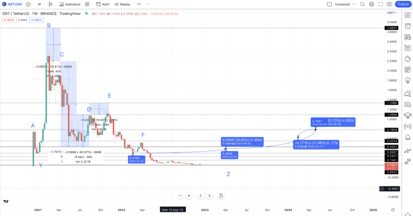 Berikut ini adalah grafik mingguan dengan poin-poin penting yang dapat membantu kita menemukan pola pada grafik harga GRT: