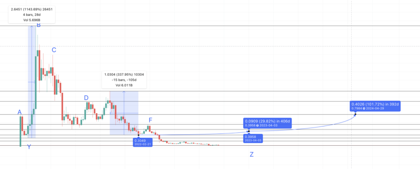 Perlu diperhatikan bahwa kami telah menempatkan rute yang sama, dengan pola yang muncul sebagai sebuah kesuksesan. Hal ini menunjukkan bahwa prediksi harga kami tetap berlaku meskipun bear market berlangsung. Selain itu, sesuai dengan pola rounded bottom, kita dapat melihat US$0,1597 sebagai level terendah di tahun 2023 dan level tertingginya tetap stabil di US$0,6266.