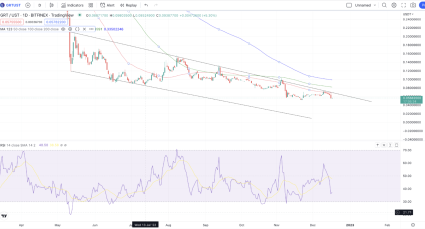 Grafik harga GRT jangka pendek mengisyaratkan pola descending channel. Setiap pergerakan di atas garis tren bullish bagian atas dapat menyebabkan reli kecil untuk GRT. Namun, moving average (50, 100, dan 200) masih terpisah dan tidak mengisyaratkan reli yang segera terjadi.