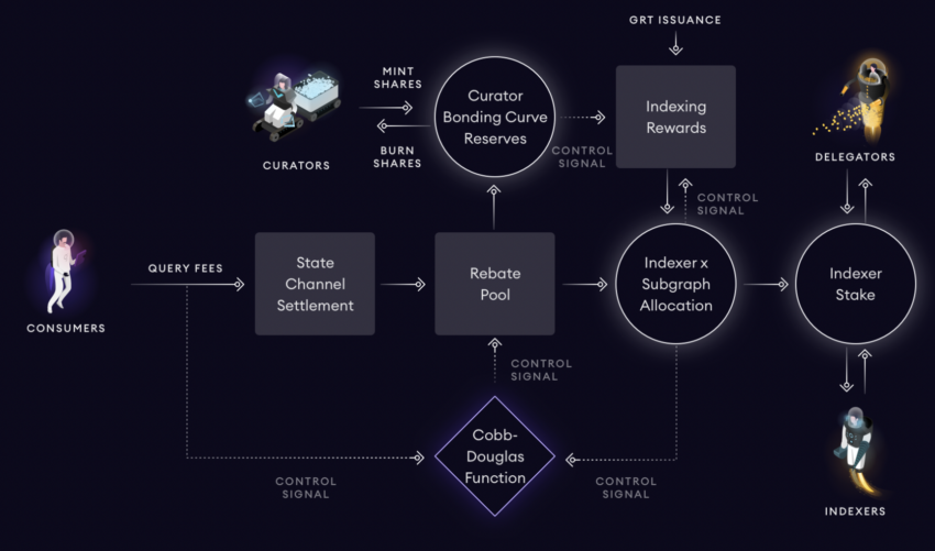 Perlu diperhatikan bahwa konsumen membayar GRT atau biaya, sedangkan Curator, Delegator, dan Indexer menerima bayaran.