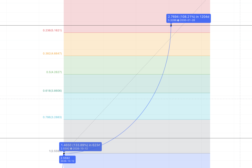 Titik terendah untuk tahun 2030 dapat muncul di mana saja di sekitar angka US$4,26 — bertepatan dengan titik 50% pada indikator Fibonacci.