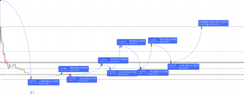 Di sinilah menariknya. Berbeda dengan pola pertama, D1 lebih tinggi dari C1, yang menandai tren naik yang jelas untuk Zilliqa. Titik terendah di tahun 2026 dapat terjadi dalam 72 hari atau bahkan maksimal 175 hari, dengan penurunan sebesar 63,72%. Namun, ada support kuat di level US$0,05260, yang mungkin menjadi level terendah untuk tahun 2026.