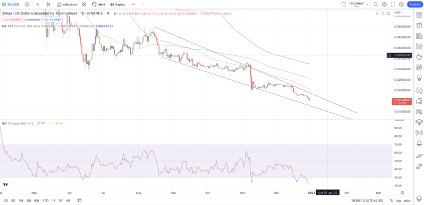 ZIL berada dalam pola falling edge, yang mungkin bullish jika berhasil menembus di atas garis tren bagian atas. Selain itu, berdasarkan grafik hariannya, indikator RSI ZIL berada di wilayah yang sangat oversold, yang dapat meningkatkan harga.
