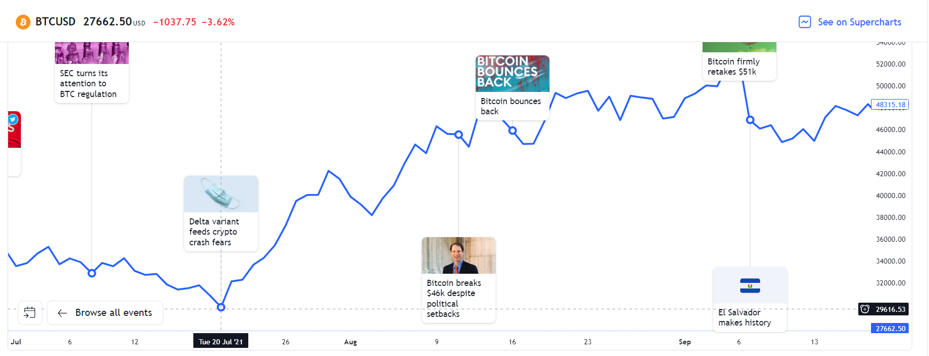 Benarkah buy the dip bisa menguntungkan dalam investasi crypto? Untuk menjawabnya, kamu bisa menggunakan data historis sebagai contoh. Sepanjang sejarah Bitcoin, ada beberapa kali terjadi harga BTC turun signifikan. Namun, Bitcoin berhasil pulih dan mencapai level harga lebih tinggi.