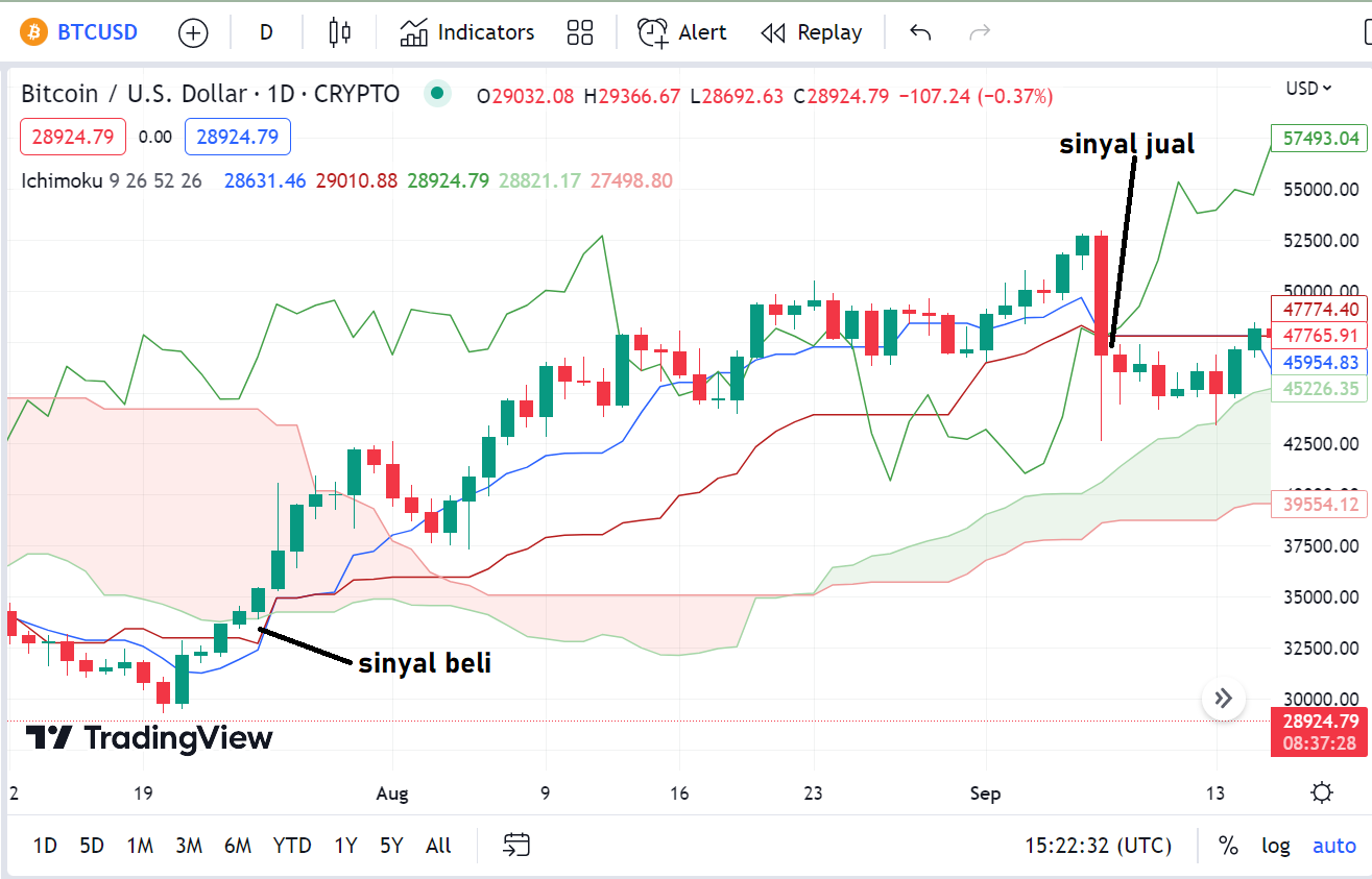 Sponsored- Jika harga berada di atas awan, ini menunjukkan tren bullish yang kuat. Sinyal jual dapat terjadi ketika garis Tenkan-sen (garis konversi) memotong garis Kijun-sen (garis dasar) dari atas ke bawah, atau ketika harga bergerak di bawah garis Tenkan-sen dan Kijun-sen. Selain itu, jika garis Chikou Span (garis lagging) berada di bawah harga saat ini, ini juga menunjukkan sinyal jual yang kuat.