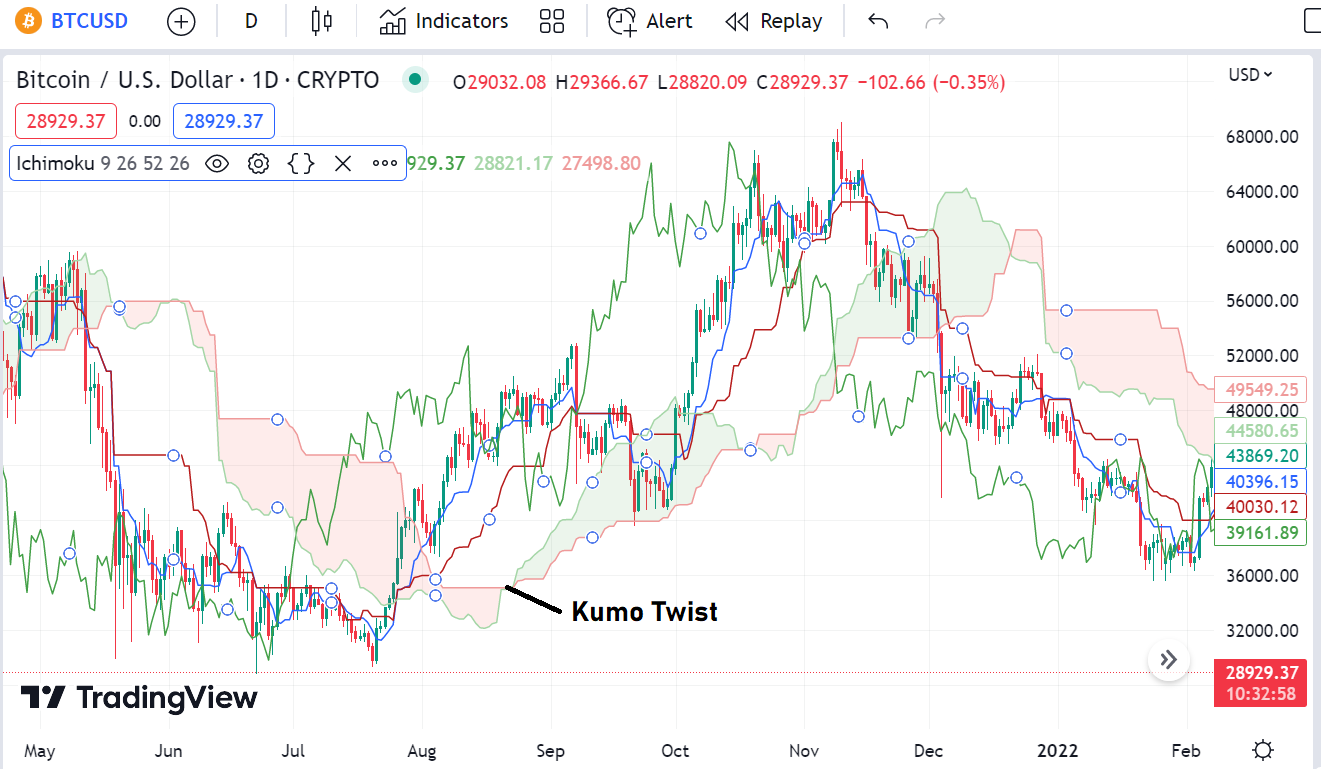 - Kumo twist: Ini menunjukkan terjadinya pembalikan (reversal) dari tren sebelumnya. Kumo twist terjadi ketika Senkou Span A dan Leading Span B saling bersilangan. Ketika Senkou Span A bersilangan di atas Senkou Span B, itu adalah sinyal pembalikan bullish. Sementara itu, ketika Senkou Span A bersilangan di bawah Senkou Span B, itu merupakan sinyal pembalikan bearish.