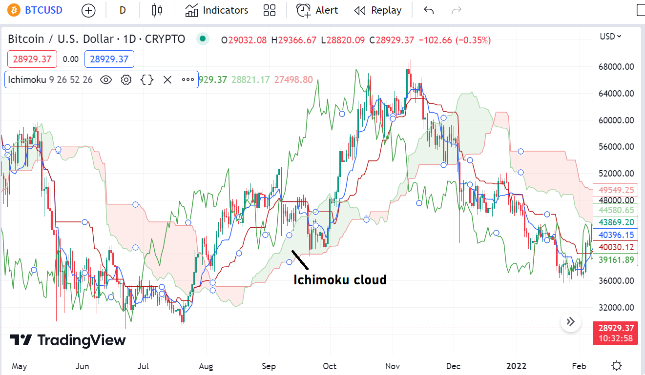 Jika Senkou Span A berada di atas Senkou Span B, aset cryptocurrency yang mendasarinya kemungkinan sedang bergerak ke arah negatif. Ketika ini terjadi, arsiran awan akan berwarna merah. Meskipun grafiknya rumit, hanya dengan melihat warna awan dapat membantu trader menentukan arah pasar.
