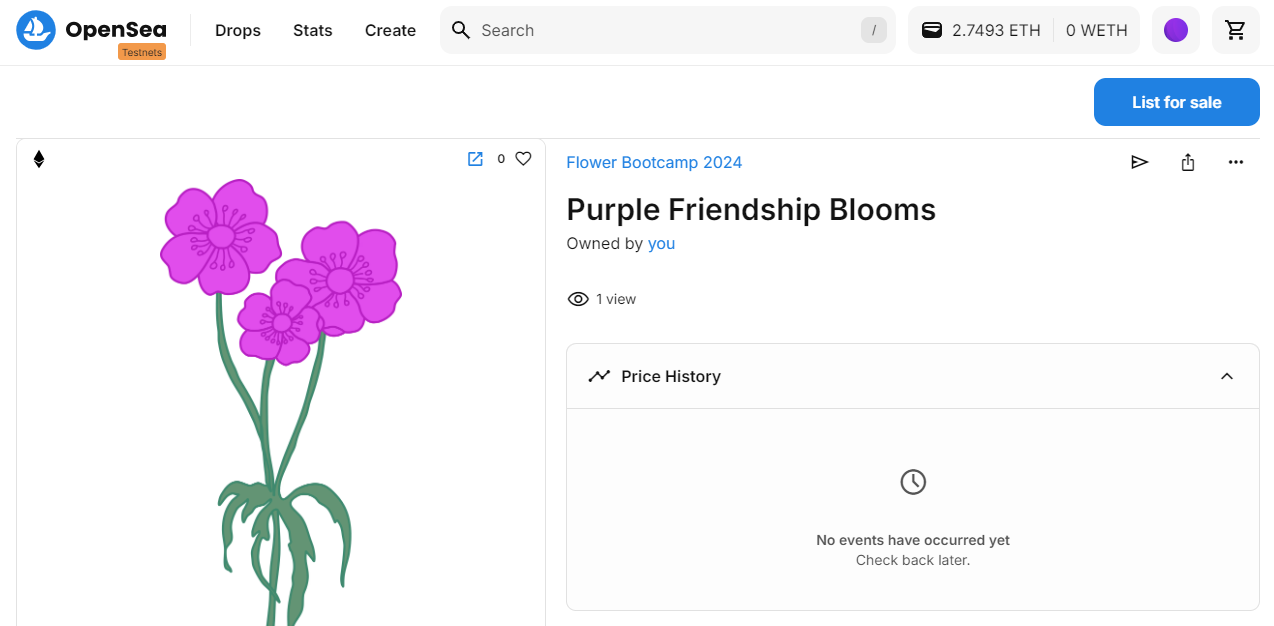Pada gambar di atas, kamu dapat melihat metadata untuk apa yang tampak seperti NFT dinamis purple flower (bunga ungu). Itu terletak di IPFS. Pada gambar di bawah ini, kamu dapat melihat rendering sebenarnya dari metadata itu, yang sebenarnya adalah bunga ungu.