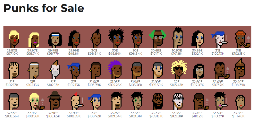 CryptoPunks adalah 10.000 gambar koleksi unik yang ada di blockchain Ethereum. Potret pixel pop art avatar punk ini terbit menggunakan algoritme dan tokenisasi.