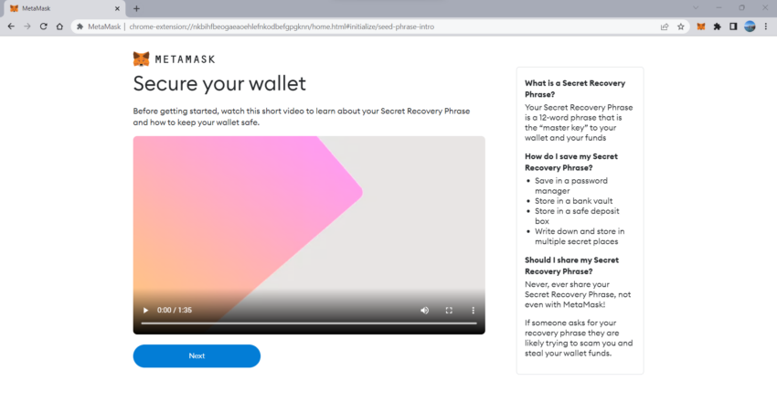 Selanjutnya, MetaMask akan meminta Anda untuk membuat kata sandi baru. Pastikan untuk membuat kata sandi yang kuat. Setelah itu, akan ada halaman yang menjelaskan cara kerja dan pentingnya Secret Recovery Phrase, serta alasan mengapa Anda perlu menjaganya kerahasiaannya.