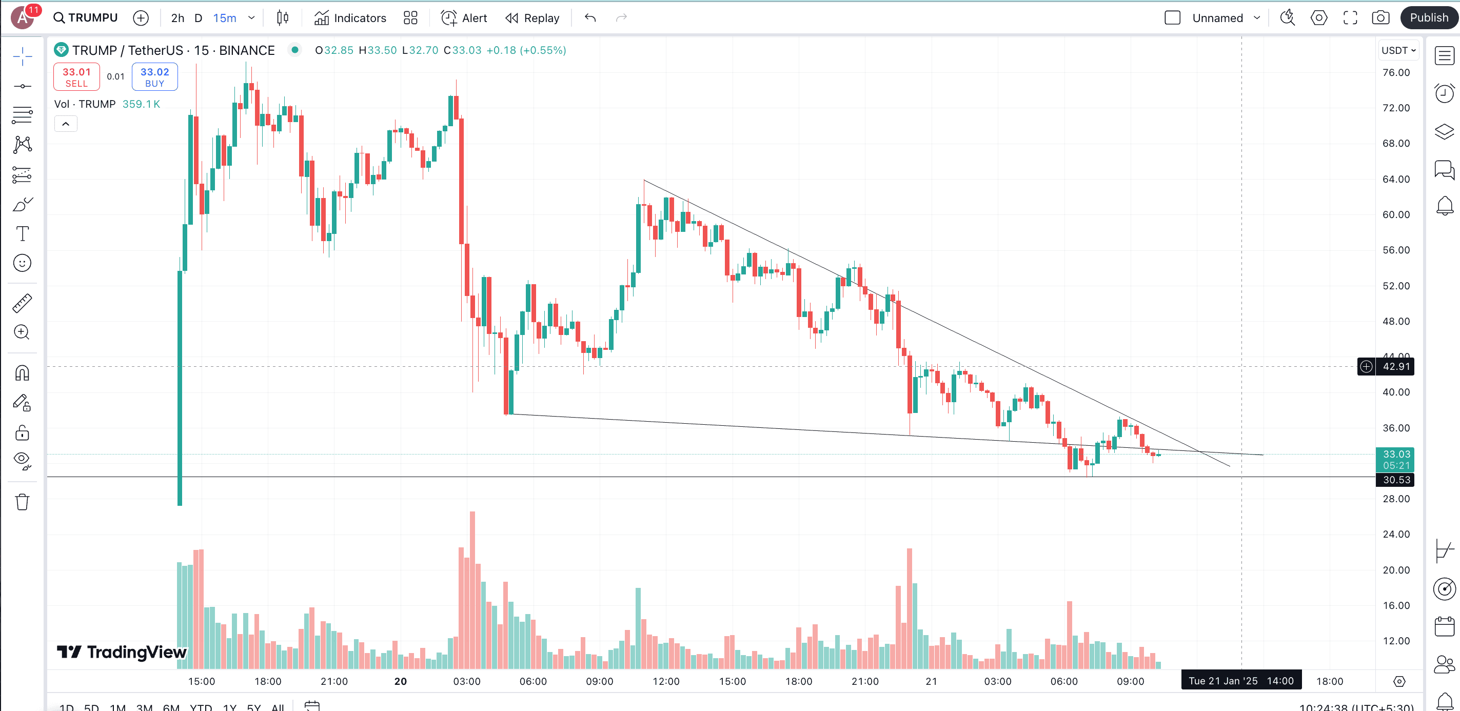 $TRUMP Coin muncul hanya beberapa hari sebelum pelantikan Presiden terpilih Donald Trump. Koin ini memulai debutnya dengan harga sekitar US$10 per token. Tak lama setelah rilis, meme coin ini mengalami lonjakan substansial, mencapai level tertinggi sepanjang masa sekitar US$72 per token.
