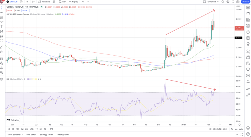 Harga CTXC naik 41,11% week-on-week pada 8 Februari 2023. Selain itu, grafik harian A menunjukkan bahwa kemungkinan akan ada konsolidasi kecil yang segera terjadi. Terakhir, perhatikan adanya pola bearish divergence pada indikator RSI yang membentuk lower high. Sebaliknya, grafik harga CTXC membuat higher high.