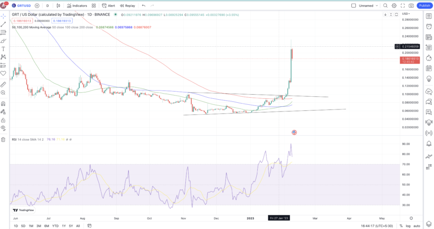 GRT, native token The Graph, terpantau sudah naik 113,64% selama seminggu terakhir pada saat publikasi. Harganya berpotensi bakal terbang lebih tinggi lagi. Pada grafiknya, kamu bisa menyaksikan bahwa garis hijau (moving average 50 hari) melintasi garis biru (MA 100 hari), dan inilah yang memulai reli harga GRT. Selain itu, garis hijau juga bergerak menuju garis merah, dan persilangan apa pun dapat memicu harganya naik lebih tinggi. Terkait hal ini, harganya berpeluang naik menuju level US$0,215.