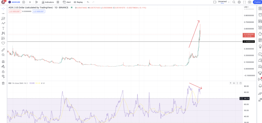 Cukup jelas terlihat bahwa indikator RSI AGIX saat ini tengah membentuk lower high, sedangkan aksi harganya sedang membuat higher high. Pola bearish divergence ini mungkin akan menyebabkan sedikit penurunan, dengan support kuat di level US$0,408.