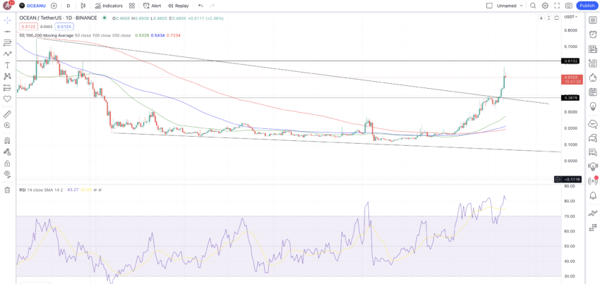 Saat penulisan, OCEAN, yang merupakan native token ERC-20 dari ekosistem berbasis AI ini, diperdagangkan pada US$0,5177, naik 50% selama tujuh hari terakhir. Selain itu, grafik hariannya menunjukkan tren yang menarik. Di dalamnya, terlihat bahwa OCEAN baru-baru ini telah menjebol falling wedge dan mungkin sedang menuju level US$0,6132, yang merupakan garis resistance berikutnya.