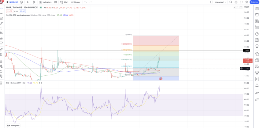 Seperti crypto AI lainnya, harga NMR bahkan ikut naik. Terbukti harganya mencetak kenaikan hampir 40% selama seminggu terakhir. Grafik teknikalnya juga mengungkapkan bahwa harga NMR sedang bergerak menuju momentum, tampak kuat meskipun ada koreksi pasar yang lebih luas.