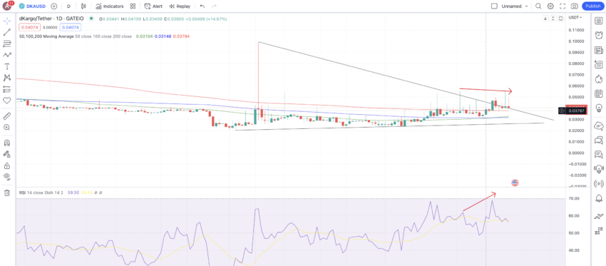 Pada saat publikasi, DKA, native token dKargo dan salah satu crypto AI teratas, telah naik hampir 16% selama seminggu terakhir. Namun, grafik harga hariannya menunjukkan bahwa dKargo berada di wilayah yang perlu diwaspadai untuk saat ini. Garis moving average DKA juga terkait erat, diperdagangkan sangat dekat dengan garis tren dari pola segitiga.