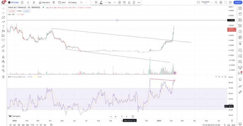 Selain itu, grafik hariannya mengungkapkan bahwa FET telah menjebol pola falling wedge, lebih jelas dari yang diperkirakan, dan akhirnya diperdagangkan di level US$0,5344. Namun, kita dapat mengharapkan adanya beberapa konsolidasi jangka pendek untuk FET karena pola bearish divergence yang nampak indikator RSI. Lebih lanjut, momentum pembelian tampaknya juga sudah memudar, dengan RSI yang mencetak titik lower high.