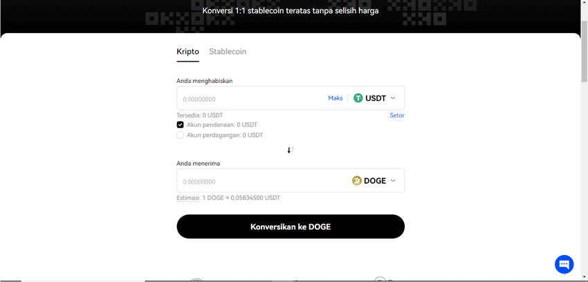 Jika sudah memiliki USDT, kamu bisa mengeklik menu “Trading” dan pilih “Konversi”. Masukkan jumlah DOGE yang ingin dibeli dan sistem akan menghitung harganya secara otomatis. Proses ini tidak membebani selisih harga pada pengguna. Bila nilainya sudah sesuai, klik “Konversikan ke DOGE” dan koinnya akan langsung masuk ke akun kamu.