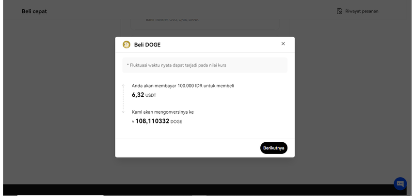 Kamu akan melihat notifikasi sembul (pop-up notification) berisi informasi jumlah konversi USDT ke DOGE yang akan dibeli. Bila angkanya sudah sesuai, segera klik tombol “Berikutnya”.