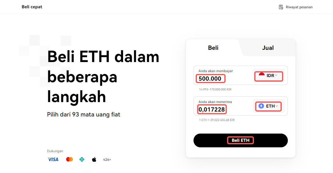 Kemudian, kamu akan diarahkan pada laman pembelian kripto. Karena kita ingin beli Ethereum, maka di kolomnya kita pilih ETH. Lalu, masukkan nominal yang ingin kamu beli dalam bentuk rupiah. Misalnya, kamu ingin membeli sebanyak Rp500.000, maka di kolom bagian bawah akan langsung memperlihatkan jumlah ETH yang kamu dapatkan.